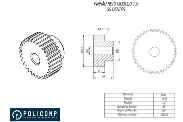ENGRENAGEM DENTES RETOS, MÓDULO 1.5 Z35