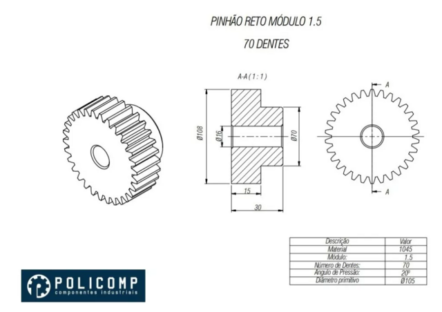 ENGRENAGEM DENTES RETOS, MÓDULO 1.5 Z70