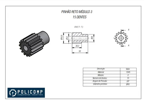 ENGRENAGEM DENTES RETOS, MÓDULO 3 Z15