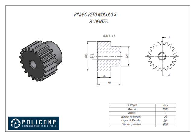 ENGRENAGEM DENTES RETOS, MÓDULO 3 Z20