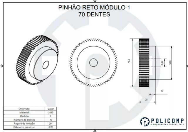 ENGRENAGEM DENTES RETOS MÓDULO 1 Z70