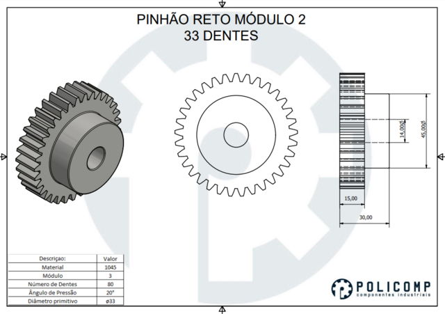 Engrenagem dente reto com 33 dentes