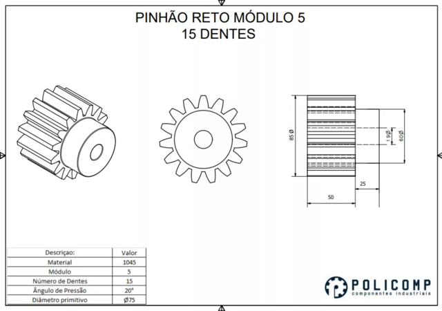 ENGRENAGEM DENTES RETOS MÓDULO 5 Z15