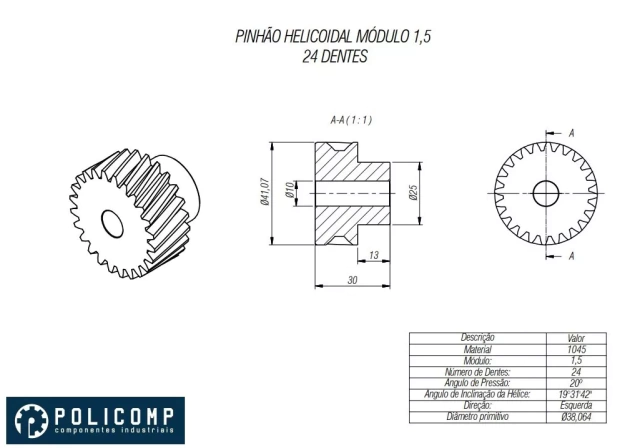 ENGRENAGEM HELICOIDAL, MÓDULO 1.5 Z24