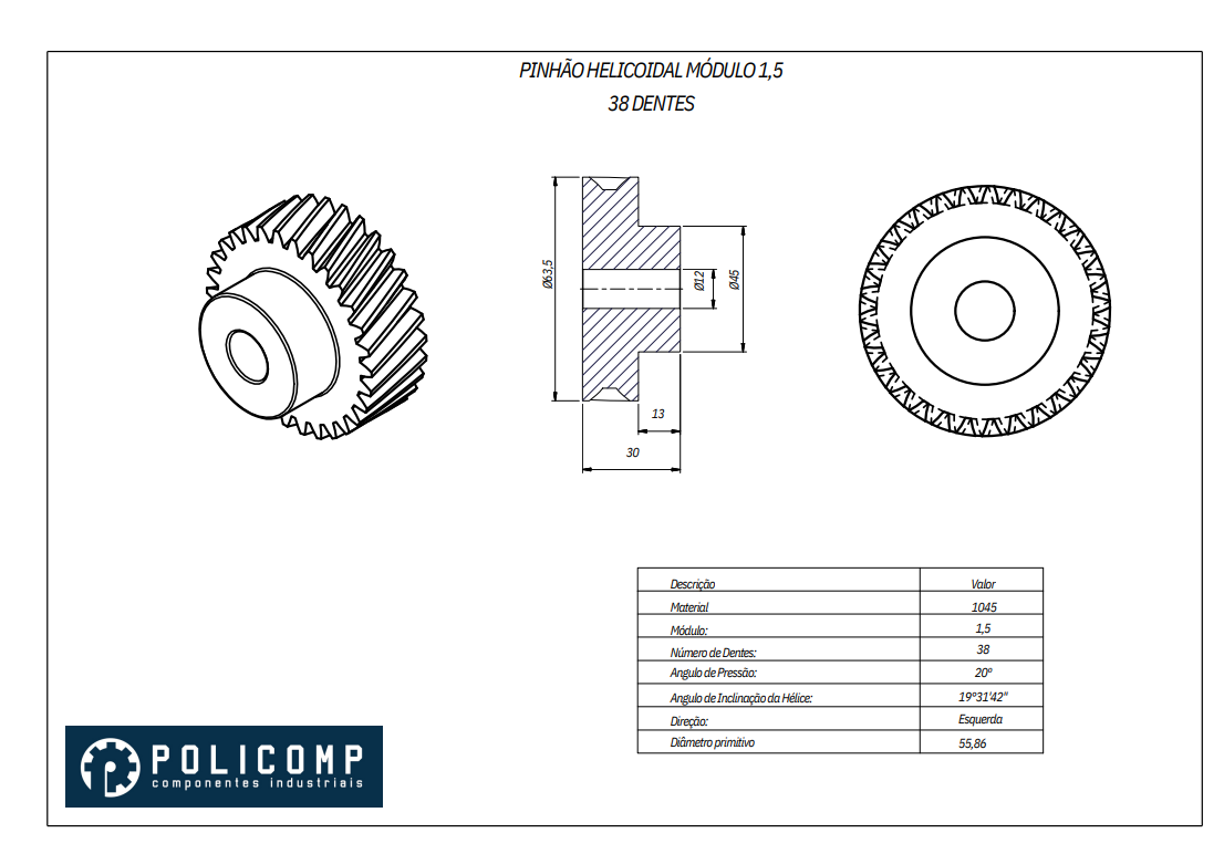 ENGRENAGEM HELICOIDAL, MÓDULO 1.5 Z38