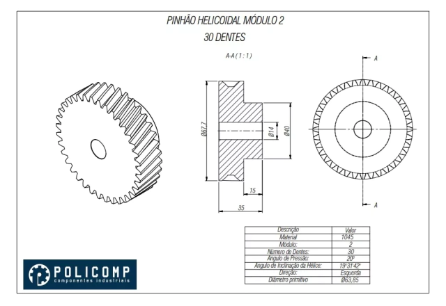ENGRENAGEM HELICOIDAL, MÓDULO 2 Z30