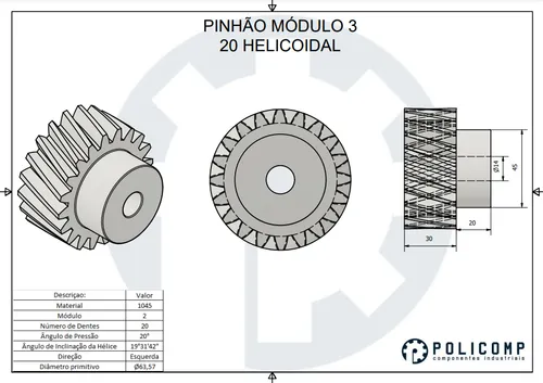 ENGRENAGEM HELICOIDAL, MÓDULO 3 Z20