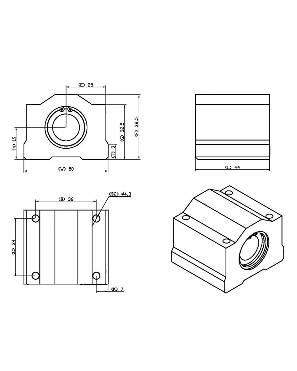 O Pillow Block fechado com rolamento LM possui mancal de alumínio, também chamado de casca, sendo ideal para aplicação em eixos lineares sem apoio.