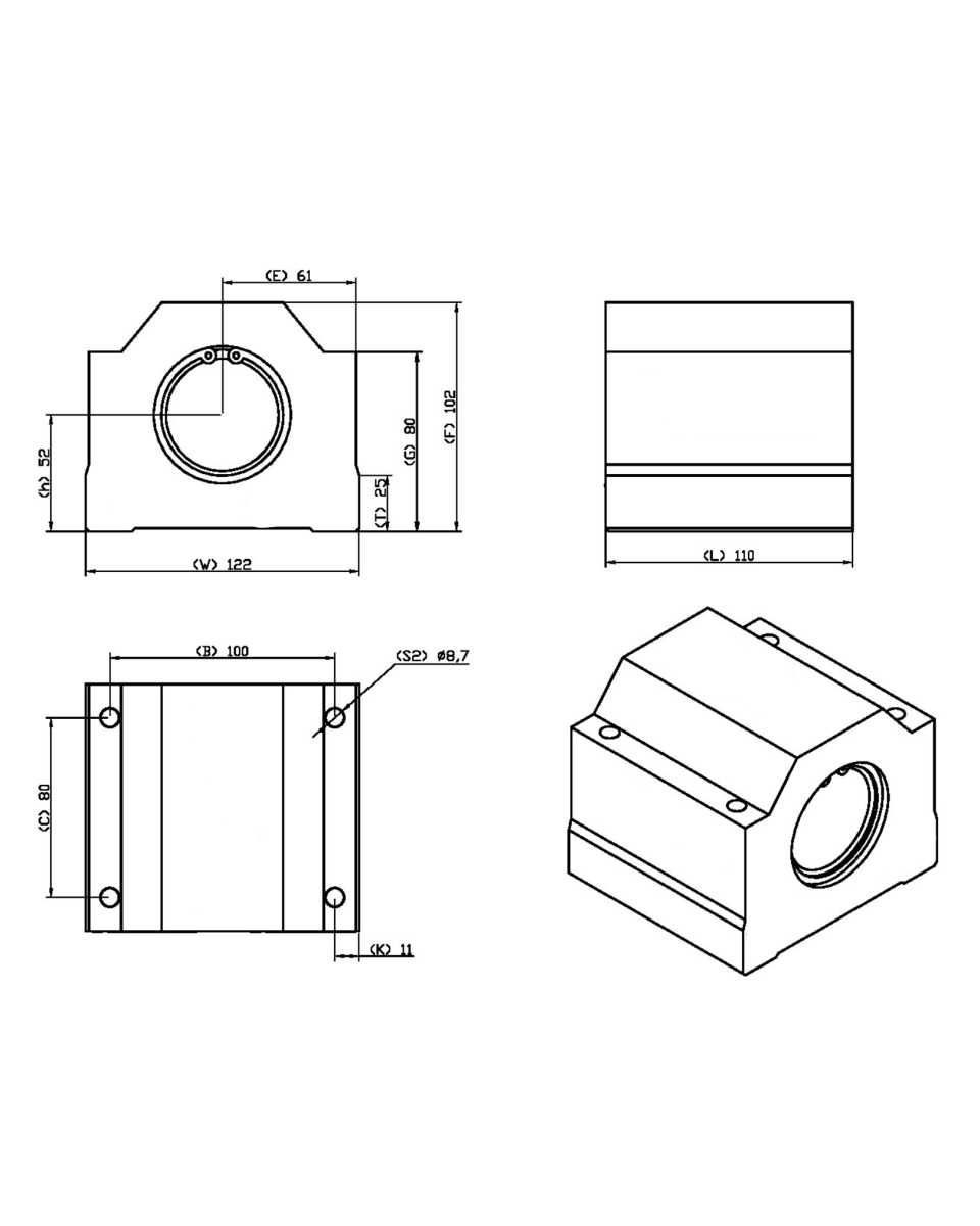 O Pillow Block fechado com rolamento LM possui mancal de alumínio, também chamado de casca, sendo ideal para aplicação em eixos lineares sem apoio.
